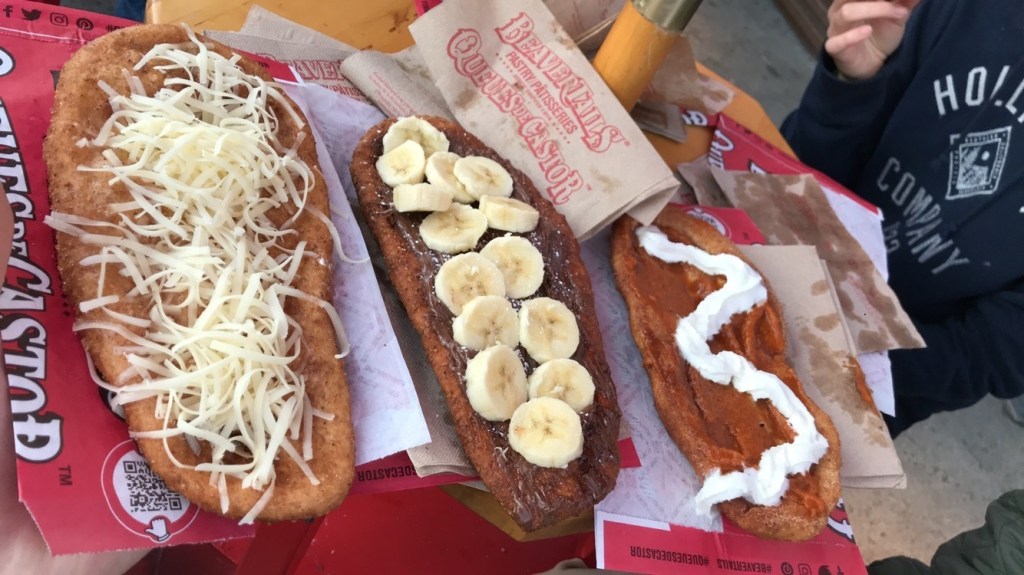 À la lecture du titre, vous avez dû vous demander « Les Canadiens mangent vraiment des queues de castor ?! ». Pour être honnête, j’ai pensé la même chose lorsque des amis m’ont proposé d’aller en manger à Ottawa. J’y ai cru dur comme fer jusqu’à notre arrivée devant ce petit kiosque marqué du nom « Beavertails », stand où l’on retrouve généralement ce fameux mets. Une douce odeur de friture s’empara alors de moi, il n’en fallut pas plus pour me convaincre de me laisser tenter. J’aperçois alors la carte avec les différentes recettes proposées, l’effet « Wow » fut instantané à la vue de toutes les déclinaisons possibles du produit, aussi alléchante les unes que les autres. J’aperçois ensuite la cuisine et la préparation de la queue de castor. Une sorte de pâte à gaufre est étirée pour lui donner sa forme si particulière, elle est ensuite plongée dans l’huile de colza brûlante. Après une rapide cuisson, elle est ensuite sortie de l’huile, égouttée et préparée au goût de chacun. Elle peut se décliner en salé avec du beurre à l’ail et du fromage ou garni à la façon d’une pizza. On la retrouve plus largement dans sa version sucrée recouverte de chocolat ou encore de sucre à la cannelle et j’en passe, les déclinaisons sont infinies !